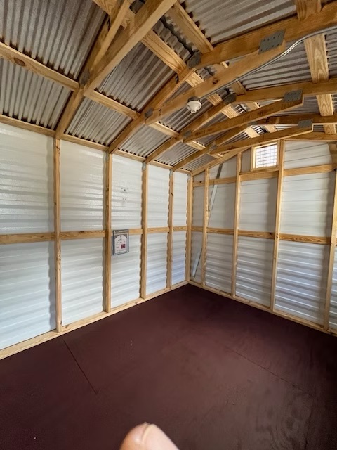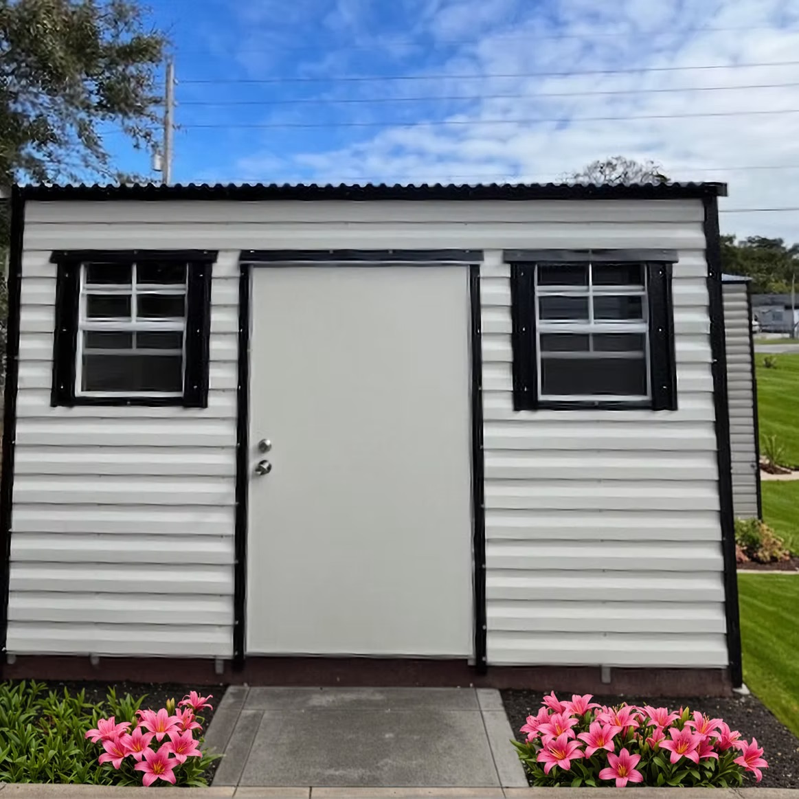 This 10 x 12 metal storage shed features GFI electrical outlets, an interior light, two grid-pattern windows with screens, a 42″ residential-grade solid core entry door, and metal vents. Cream lap metal siding with black trim and a silver reflective metal roof. 27129