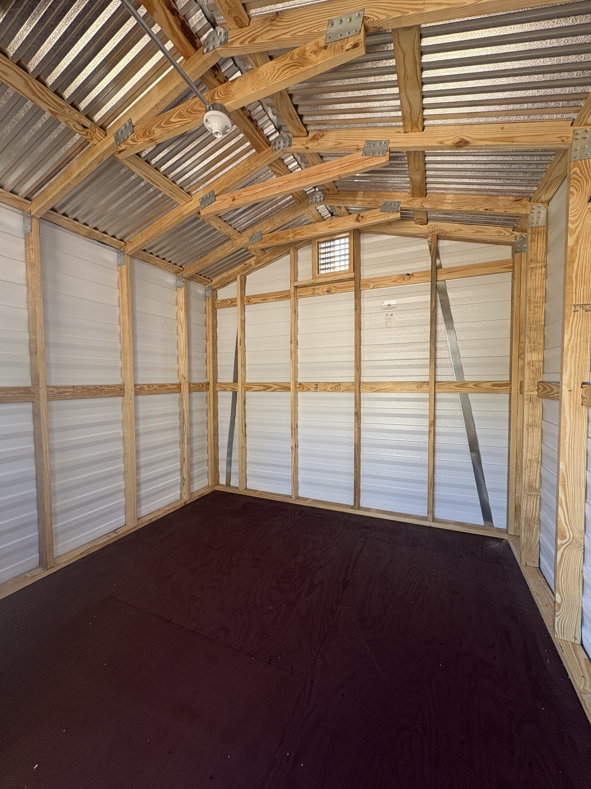 10 x 10 metal garden storage shed with GFI electrical outlets, interior light, 42″ residential-grade solid core entry door, one grid-pattern window with screens, and metal vents. 27231