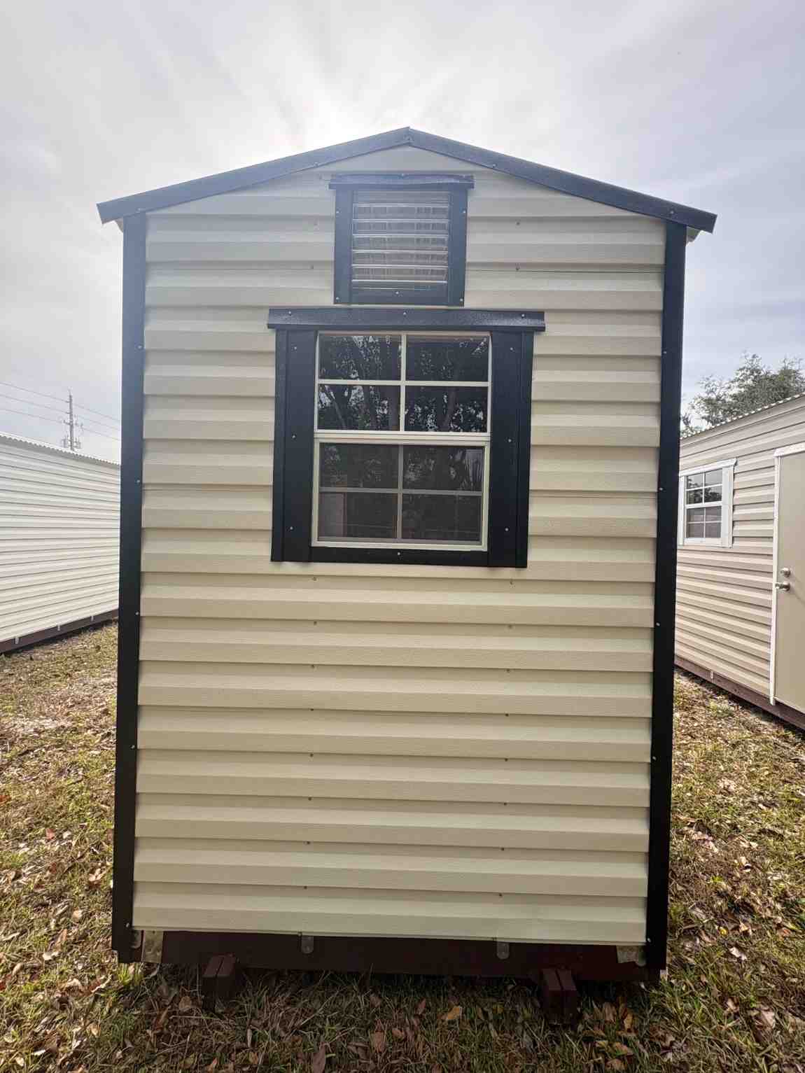 6×10 Garden Shed with Electric #4400 with Cream/Black/Silver 1 light, 1 outlet, 1 switch, 42″ door.