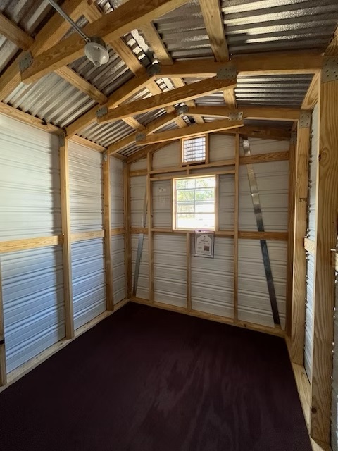 8 x 10 metal garden storage shed with GFI electrical outlets, interior light, a grid-pattern window with screen, 42″ residential-grade solid core entry door, and metal vents. Red twin rib metal siding with white trim and a silver reflective metal roof. 13533